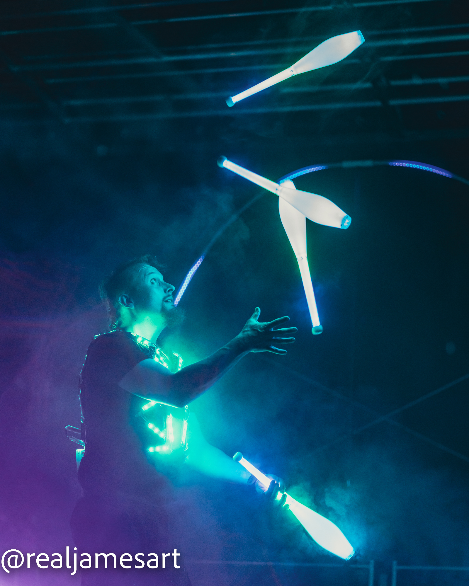 Ich hatte die Freude, die abendliche Gala der Fach-Tagung im Jugendstil-Theater Bad Nauheim mit meinen LED-Shows Light Up und Ringographie zu bereichern. Die Bühne war ungewöhnlich bestuhlt und für die Gala-Tische eingedeckt, sodass die eigentliche Show auf der Hinterbühne stattfinden musste. Dennoch entstand ein faszinierendes Spiel aus Licht, Bewegung und Präzision. Während der Dunkelheit zwischen den drei Gängen wurden die LED-Requisiten in Szene gesetzt, und die Logos der beiden Sponsoren funkelten elegant in der Luft. Die Kombination aus präziser Jonglage, Lichtdesign und Rhythmus erzeugte intensive visuelle Eindrücke, die das Publikum begeisterten.