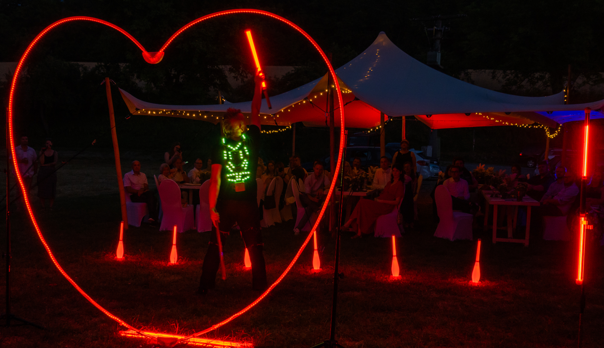Ihre Hochzeit soll genauso strahlen wie Ihre Liebe? Mit der Hochzeitsvariante der Light Up LED-Jonglage biete ich eine einzigartige Show, die modernste LED-Technik und faszinierende Effekte zu einem unvergesslichen Erlebnis verbindet. Der Höhepunkt dieser Variante ist das große, LED-besetzte Herz, das nicht nur die Bühne zum Leuchten bringt, sondern auch als wunderschöner Fotohintergrund für das Brautpaar und die Gäste dient.
